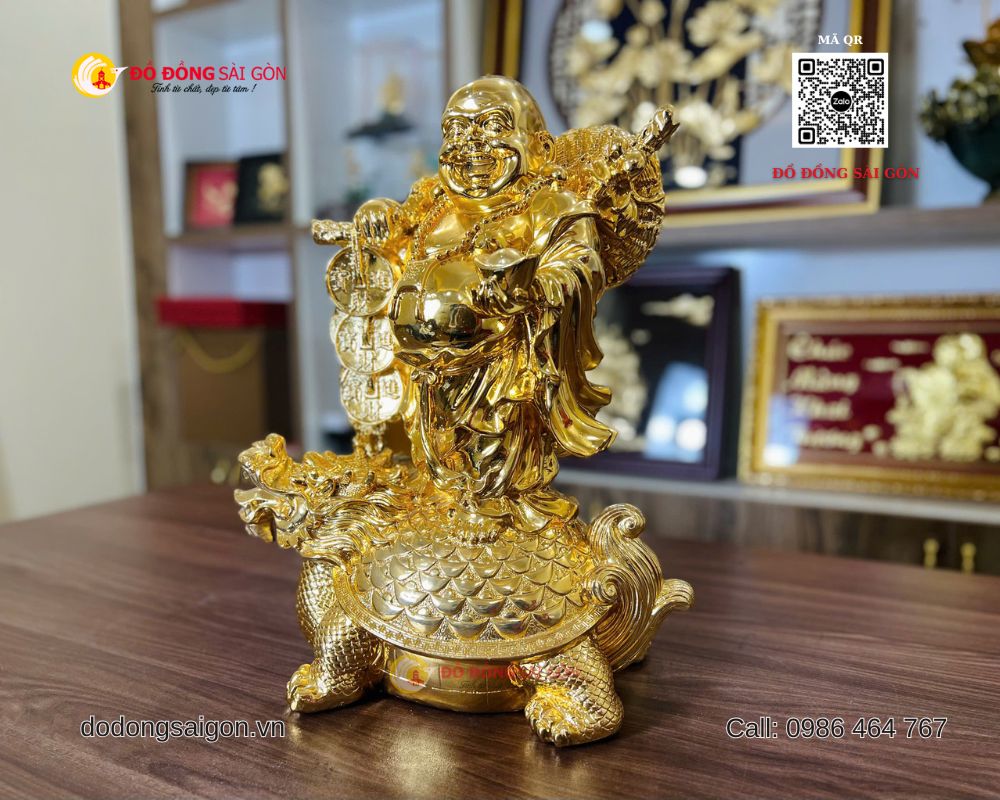 Tượng Phật Di Lặc đứng trên rùa bằng đồng mạ vàng 24k cao 50cm không chỉ là một tác phẩm nghệ thuật phong thủy tinh xảo mà còn là biểu tượng của phúc lộc bền vững – trường thọ – tài vận lâu dài. Nếu bạn đang tìm một vật phẩm phong thủy cao cấp hoặc quà tặng ý nghĩa, sang trọng, đây chính là lựa chọn hoàn hảo tại Đồ Đồng Sài Gòn – Vua Quà Tặng Vàng.