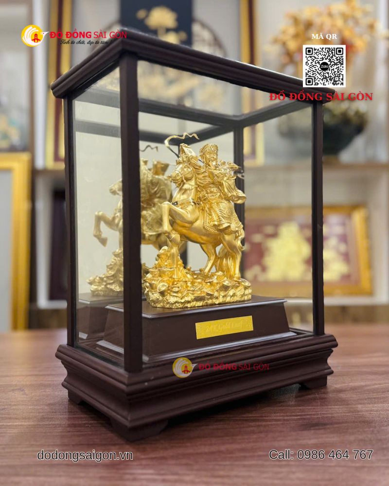 Tượng được chế tác tinh xảo với hình tượng Thần Tài cưỡi ngựa tiến về phía trước, tay cầm thỏi vàng – biểu tượng của sự sung túc, giàu có và phú quý. Màu vàng 24k óng ánh làm nổi bật từng chi tiết nhỏ trong trang phục, khuôn mặt và họa tiết.