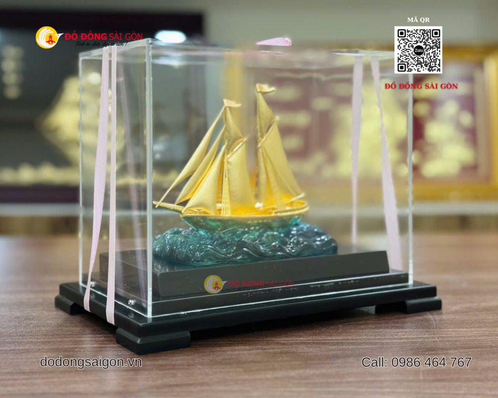 Sản phẩm được chế tác tinh xảo với thân thuyền được mạ vàng 24k, kết hợp phần sóng biển nổi khối màu xanh tạo cảm giác chuyển động chân thật. Tất cả được đặt trên đế gỗ sang trọng và bao bọc bởi hộp mica trong suốt – vừa bảo vệ, vừa tăng tính thẩm mỹ.