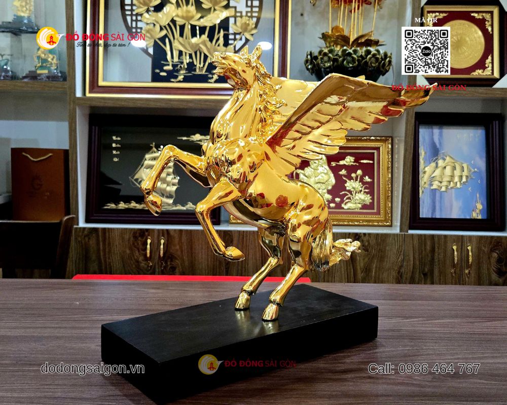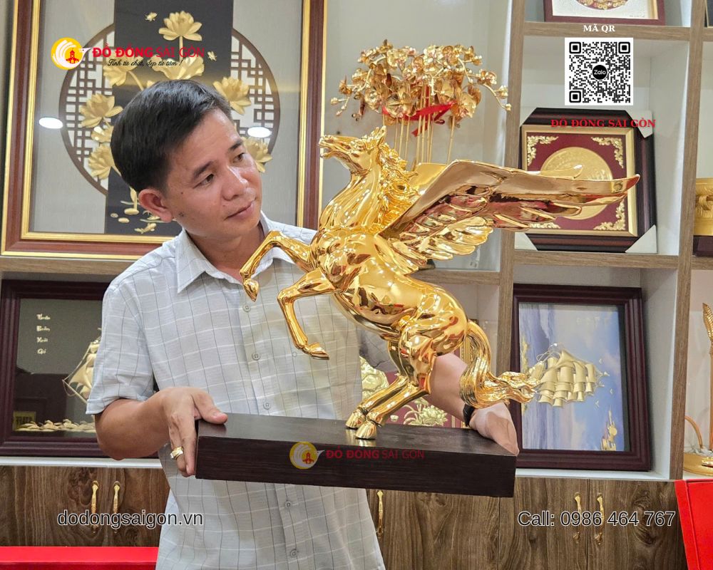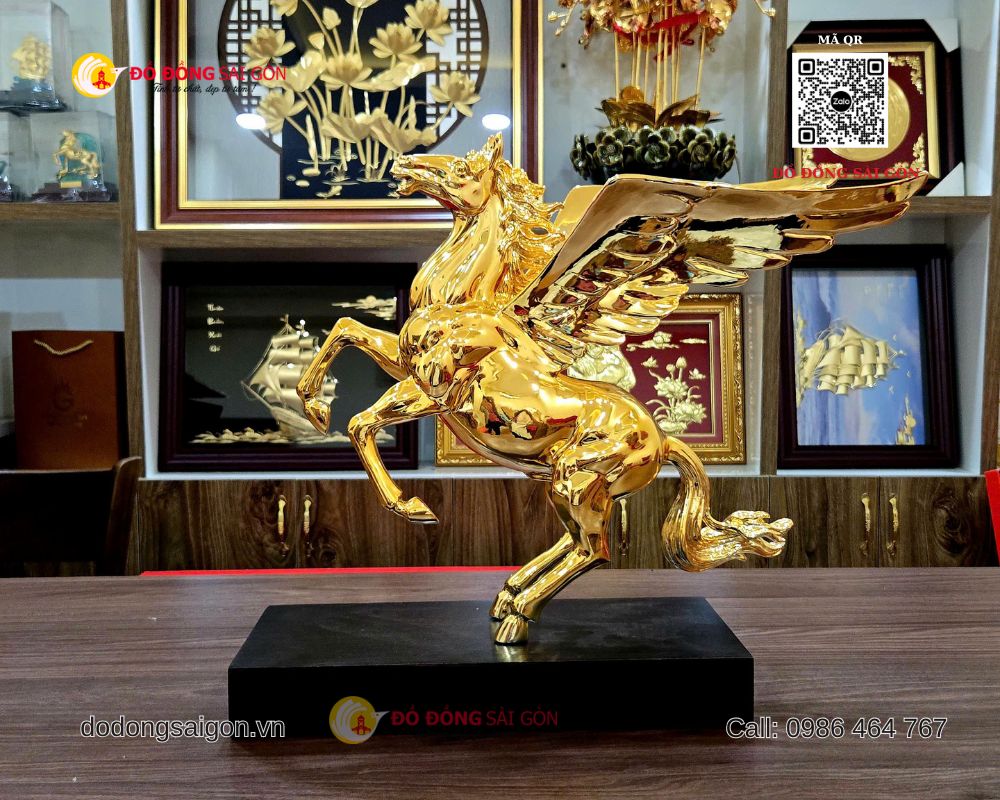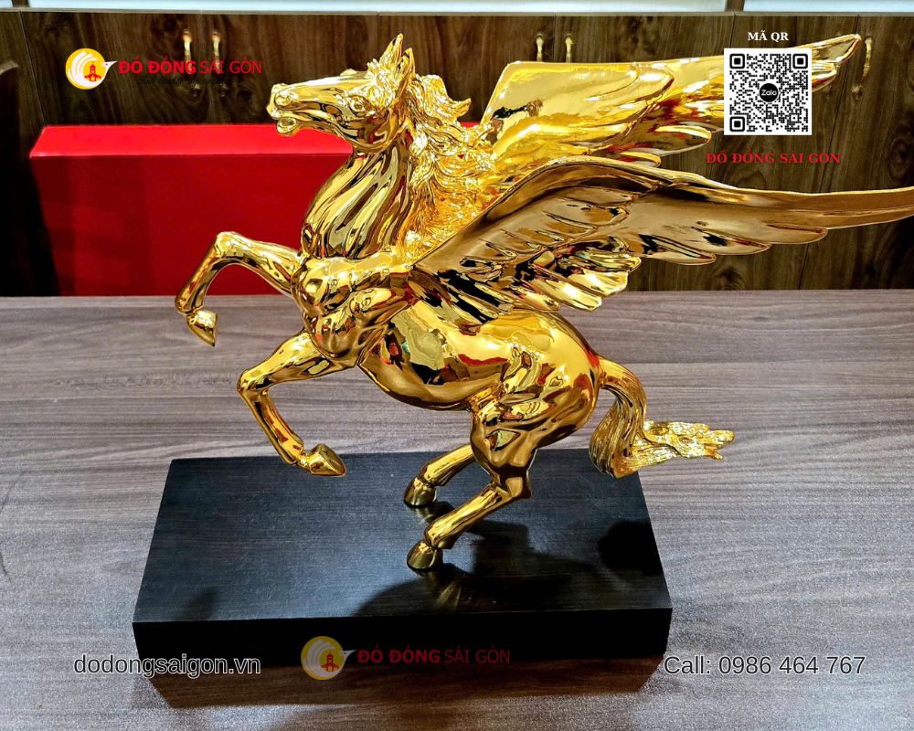 Hình ảnh chú ngựa tung cánh mạnh mẽ, dáng đứng phi nước đại, kết hợp đôi cánh rộng đầy uy lực, được chế tác tỉ mỉ từ chất liệu cao cấp và phủ vàng thật 24k, tạo nên vẻ đẹp sang trọng, sắc nét đến từng đường gân.