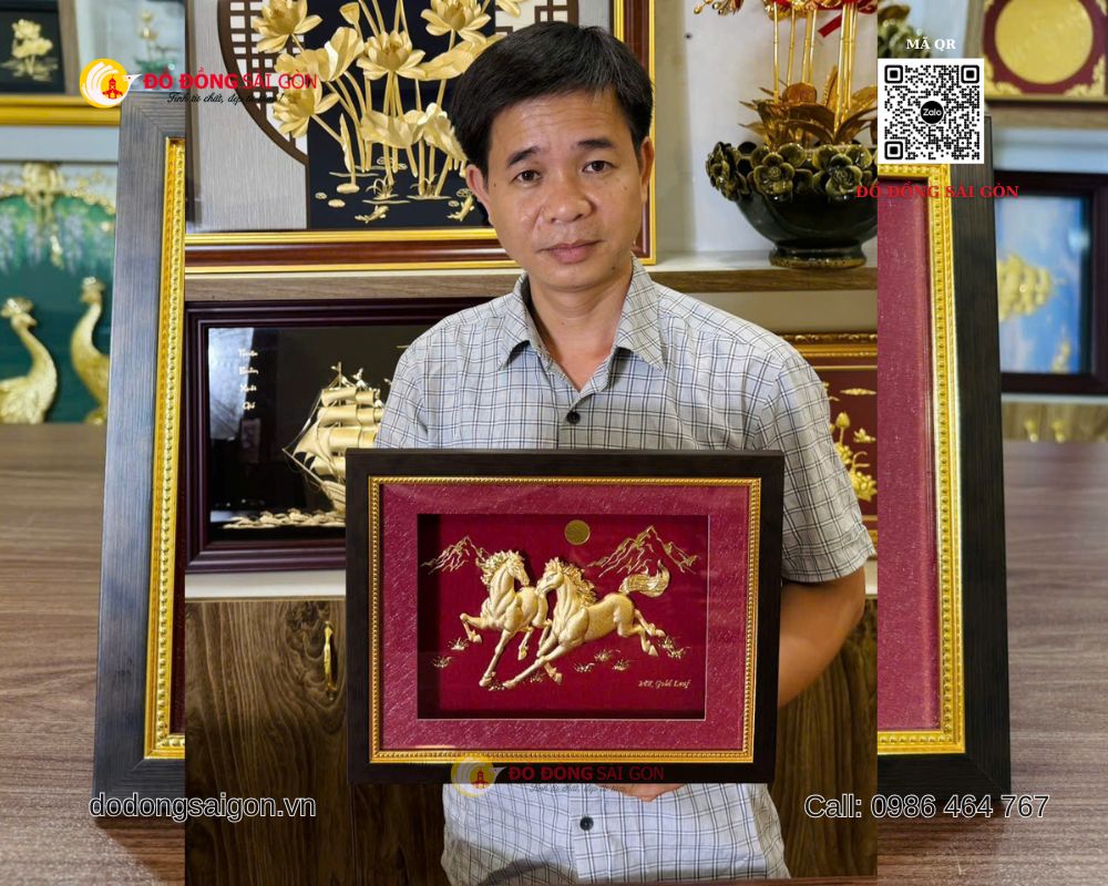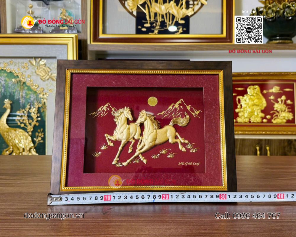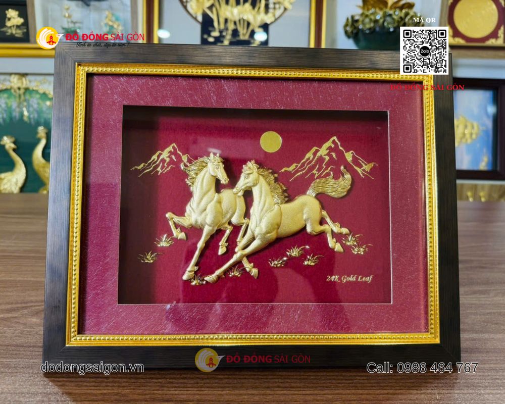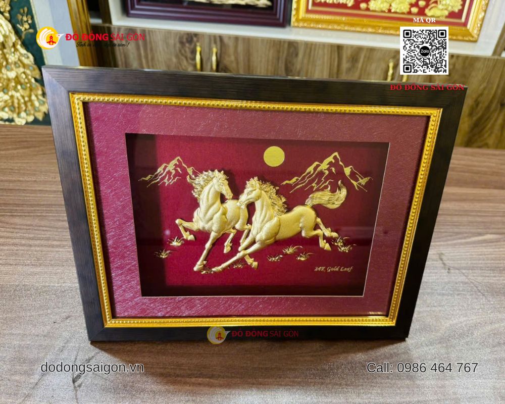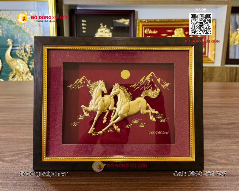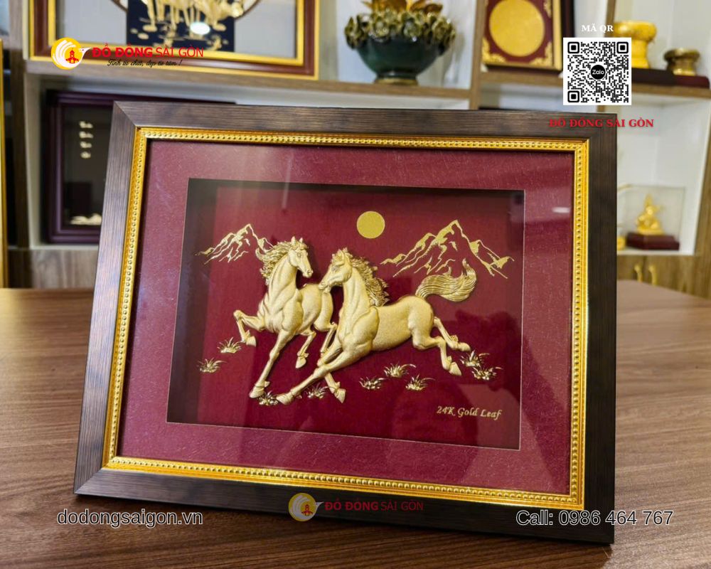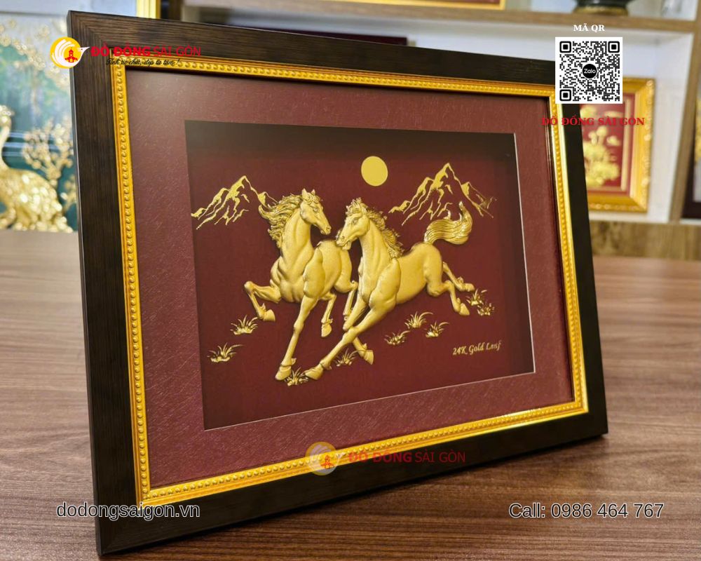 Một trong những mẫu quà tặng được yêu thích hiện nay là tranh Ngựa Song Mã bằng vàng 24k kích thước 25 x 30cm, được sản xuất và phân phối bởi ĐỒ ĐỒNG SÀI GÒN – VUA QUÀ TẶNG VÀNG – thương hiệu hàng đầu trong lĩnh vực quà tặng cao cấp, mạ vàng 24K tại Việt Nam.