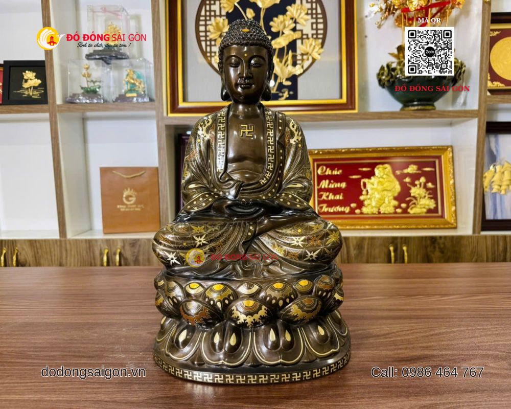 Tông màu đồng đỏ trầm ấm hòa cùng ánh vàng, bạc khảm nổi bật, khiến tượng Phật trở nên rực rỡ mà vẫn trang nghiêm. Dù trưng bày ở phòng thờ, bàn làm việc hay phòng khách, tượng đều tỏa ra năng lượng thanh tịnh và linh thiêng.