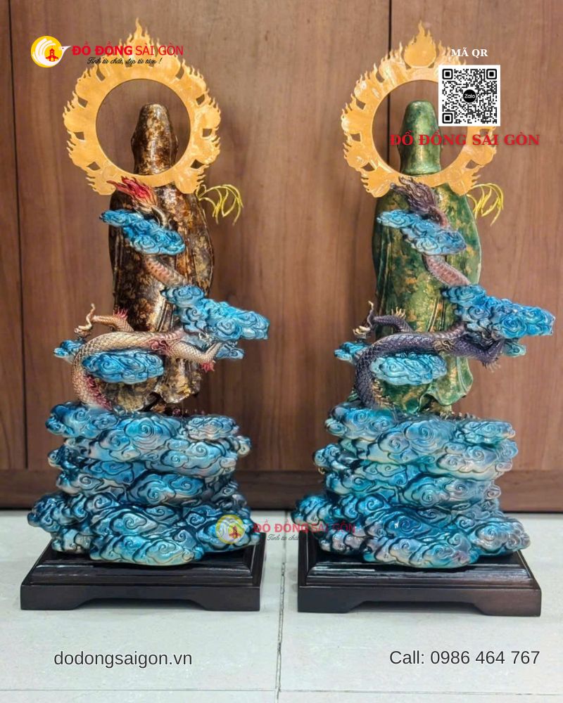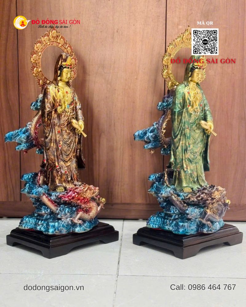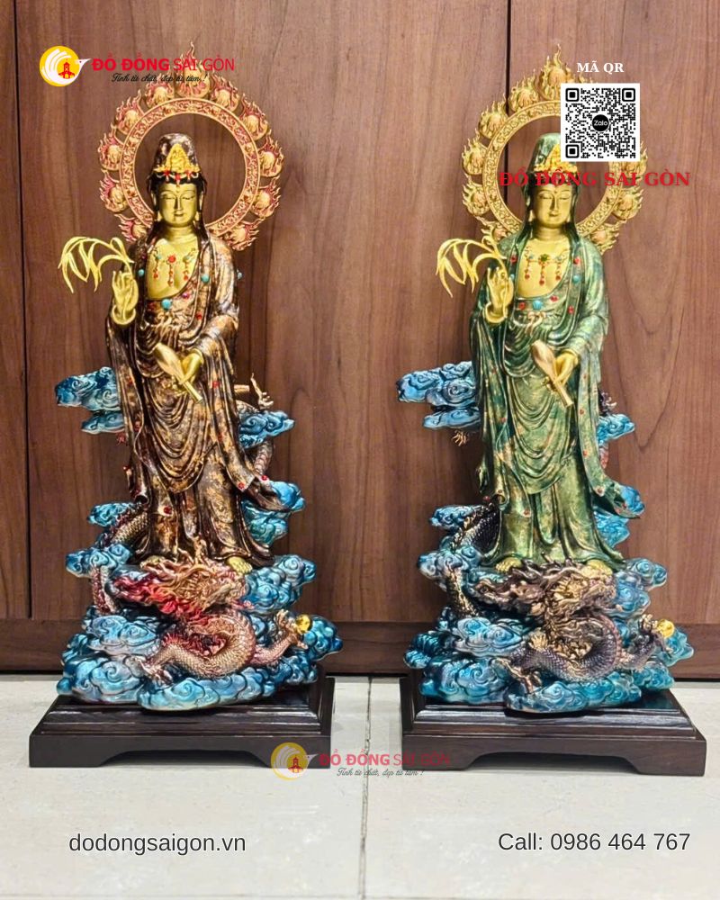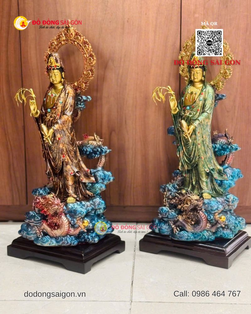 - Tượng Quan Thế Âm Đứng Trên Rồng Màu Gấm Bằng Đồng