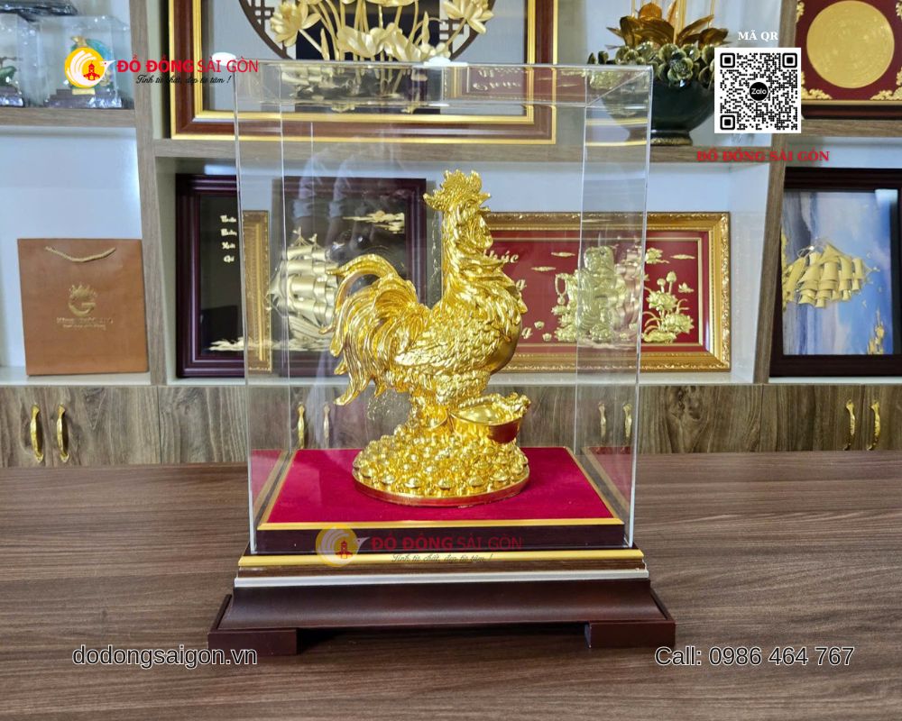 Tượng gà trống bằng đồng mạ vàng 24k là một tác phẩm nghệ thuật tinh xảo, mang đậm giá trị thẩm mỹ và phong thủy. Với kích thước cao 45cm và trọng lượng 3,5kg, sản phẩm này không chỉ là vật trang trí sang trọng mà còn là biểu tượng của sự thịnh vượng, may mắn và hóa giải sát khí trong gia đình.
